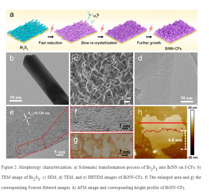 首先,在碳纤维表面涂覆一层聚四氟乙烯,经过后续的焦耳热方法处理实现了碳纤维的表面功能化(f-CFs)。随后,将Bi2S3负载在f-CFs表面,在电化学驱动下使其原位转变为三维铋纳米片网络结构(BiNN-CFs)。如图1,2所示,原位生成的铋纳米片厚度仅为4.8 nm,在其边缘存在丰富的晶格扭曲,同时纳米片相互交联形成三维网络结构。