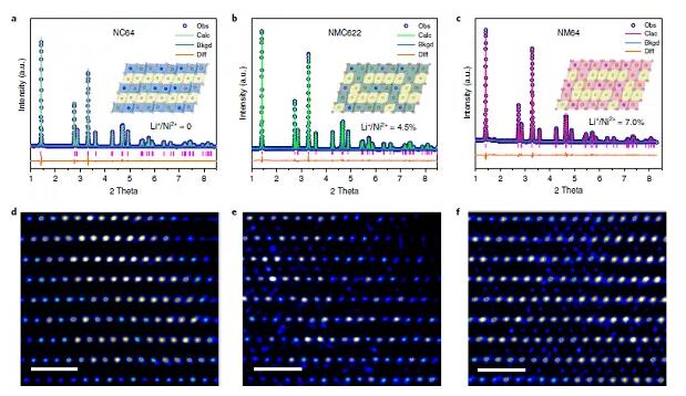 图1 通过HEXRD精修和像差校正高分辨率TEM进行定量原子占用率分析。(a)NC64、(b)NMC622和(c)NM64样品的HEXRD衍射和精修;原子级观测(d)NC64、(e)NMC622和(f)NM64样品的TEM图像。