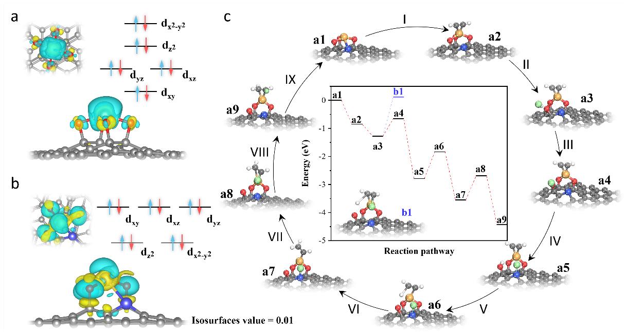 最后,对催化剂CuP-500的反应路径计算表明(图6),Cu与O-P位点之间的耦合可以大大提高催化效率,降低反应能垒。P - O位点可以诱导HCl极化解离成H和Cl原子,避免了乙炔与HCl一步加成的高能量势垒。此外,Cu活性中心在反应过程中的电荷波动可以通过耦合Cu和O-P位点来消除,从而大大提高了催化剂的稳定性。